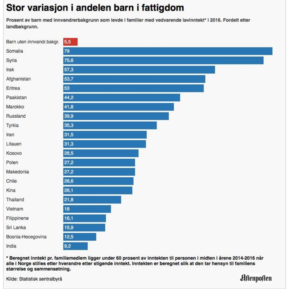 SSB la også frem en detaljert grafikk som viser hvilke barn som er de fattigste i Norge. Vi foretrekker denne som Aftenposten har laget da den viser prosentandelene for hver gruppe: