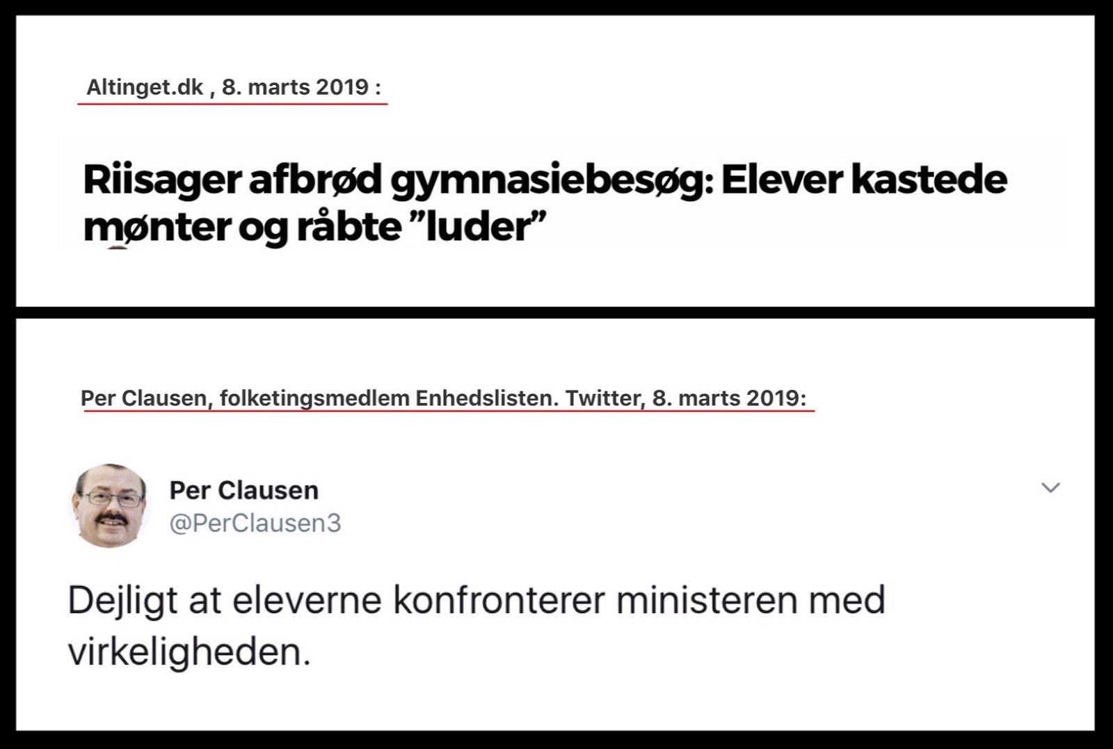 Dagbladet hevder at skolens ledelse og elevene angret seg og ba om unnskyldning. Den underslår at Enhedslistens medlemmer av Folketinget roste overfallet på undervisningsministeren.