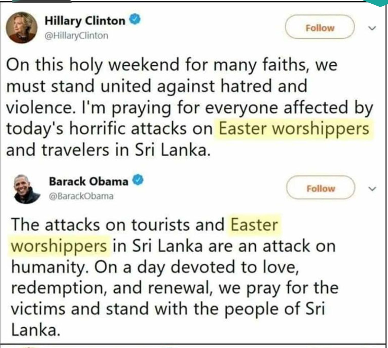 Når Hillary Clinton og Barack Obama skal uttrykke empati med ofrene på Sri Lanka, finner de opp et nytt begrep: Easter worshippers. Det minner om soltilbedere, om noe hedensk.