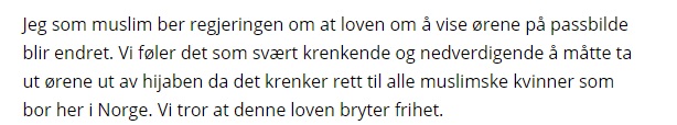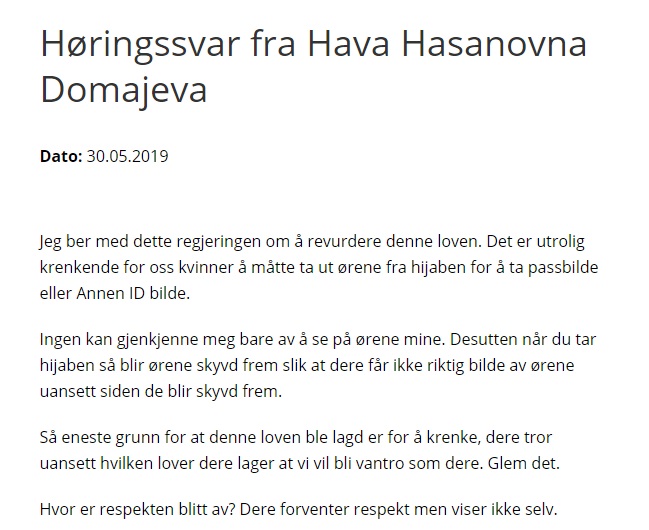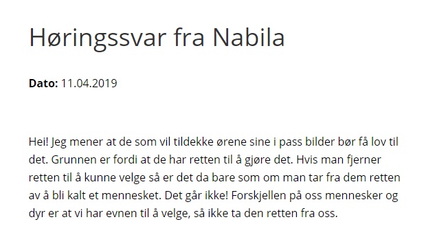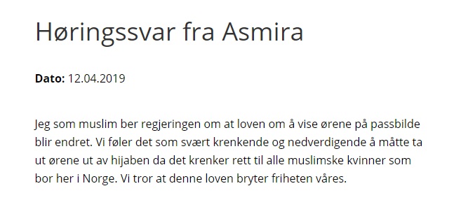 «Vi tror at denne lov bryter frihet». Frihet? Hva med oss som mener at hijab bryter med frihet? Vi klikker oss inn på et tilfeldig utvalg av de hundrevis av svarene: