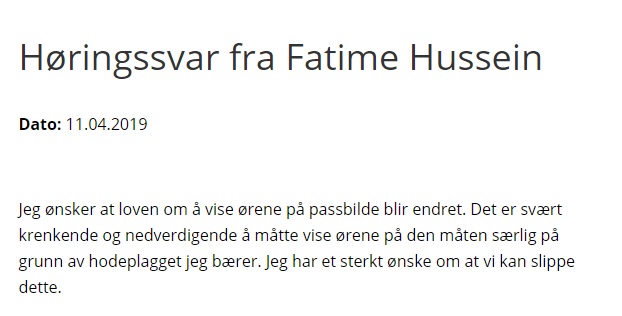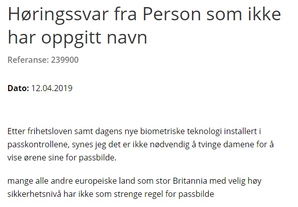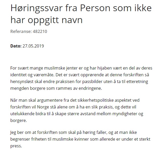 Hvem er forøvrig alle disse privatpersonene som har svart på en offentlig høring om passfotoregler i Norge? Er høringsinstansene gjort om til meningsmålinger for privatpersoner rent generelt, eller gjelder det bare når muslimer føler seg krenket?