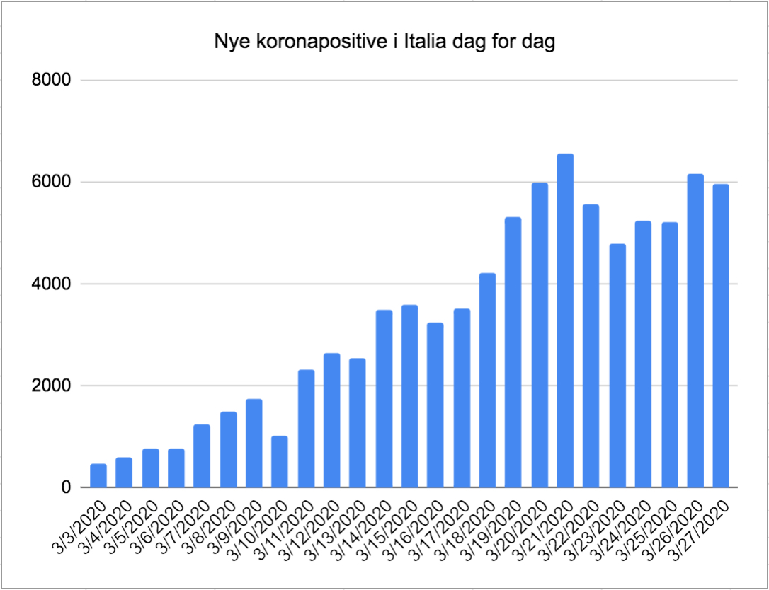 Italienske epidemiologer forklarer at den siste tidens hopp oppover skyldes forsinket registrering, skriver La Stampa. Hvis man tenker seg noe av de to siste søylene smurt utover de fire søylene i forveien, avtegner det seg dermed et bilde av en langsomt nedadgående trend i antallet nye smittede.