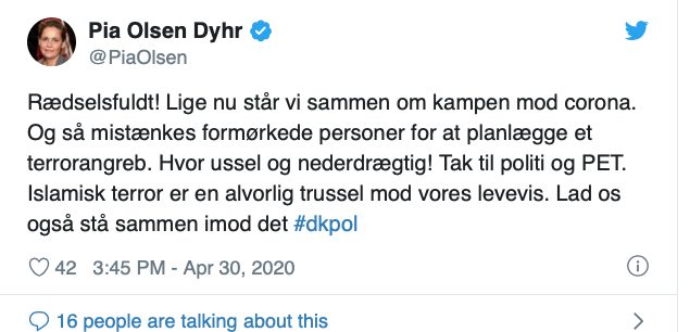 SFs Pia Olsen Dyhr grep til twitter og uttrykte sitt sjokk over at noen ville begå terror i en nasjon som sto sammen mot en usynlig fiende, coronaen.