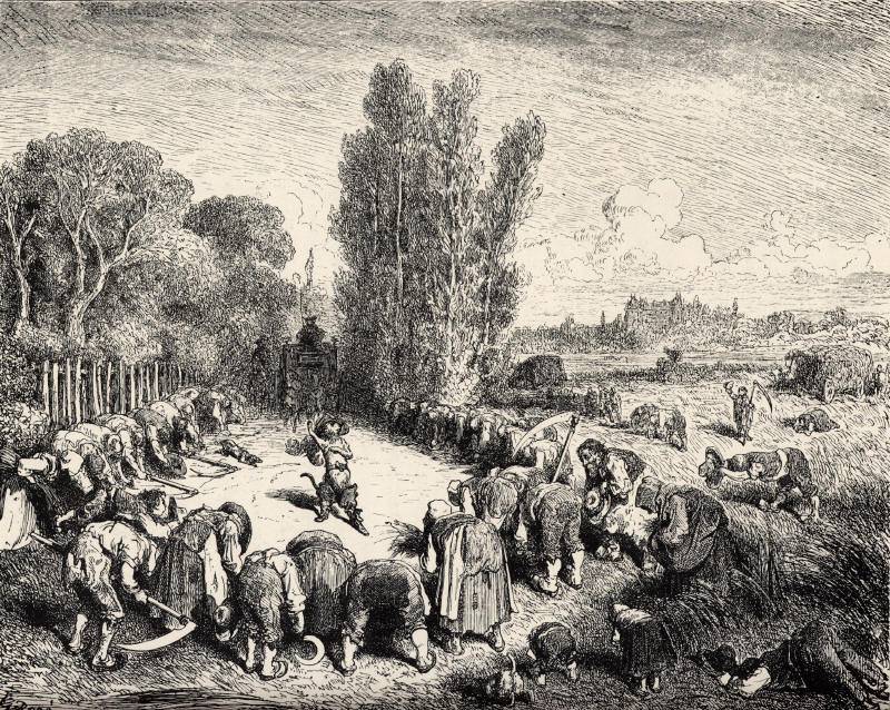 I Dorés illustrasjon instruerer katten trollets tjenestefolk om hva de skal fortelle kongen når hans følge kommer, ellers…