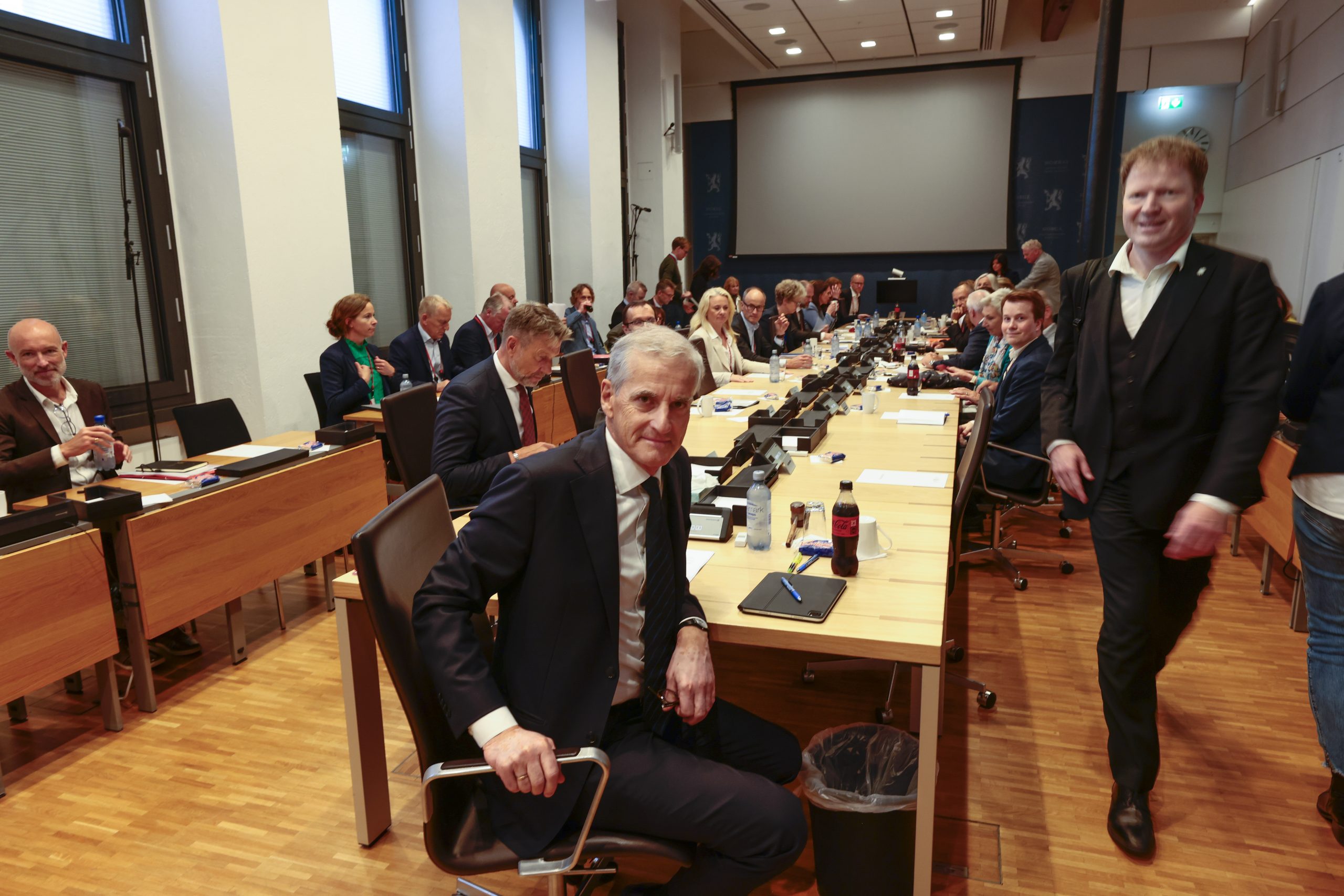 Statsminister Jonas Gahr Støre (Ap) og kommunal- og distriktsminister Sigbjørn Gjelsvik (Sp) befinner seg i forgrunnen under et toppmøte om havvind i forbindelse med regjeringens arbeid med «grønt industriløft» i Oslo den 10. juni 2022. Til stede under møtet var også Statkrafts konsernsjef Christian Rynning-Tønnesen, NHOs viseadministrerende direktør Anniken Hauglie, LO-leder Peggy Hessen Følsvik, klimaminister Espen Barth Eide (Ap) og energiminister Terje Aasland (Ap). Du fikk kanskje ikke noe referat? Foto: Geir Olsen / NTB.