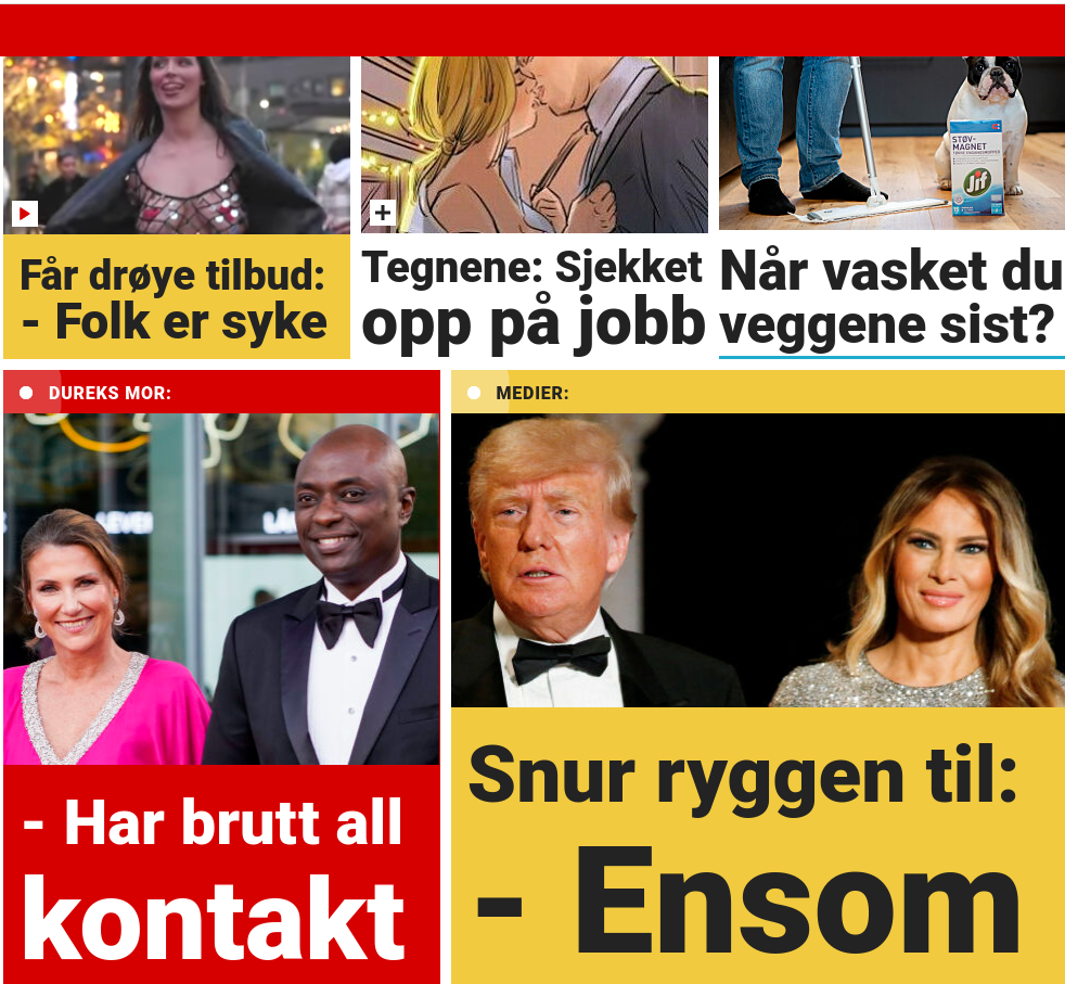 Dagbladet toppet med en sak om at svenskene måper over den norske langrennskometen Kristine Stavaas Skistad. Først lenger ned på siden kommer Trump, og Durek. Ikke akkurat noe å måpe over når det gjelder Dagbladet. Skjermdump: Dagbladet.no
