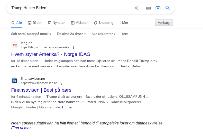 Et Google-søk fredag morgen med søkestrengen Trump og Hunter i samme sak, avdekket kun ett oppslag, fra Norge IDAG. Skjermdump: Google.com