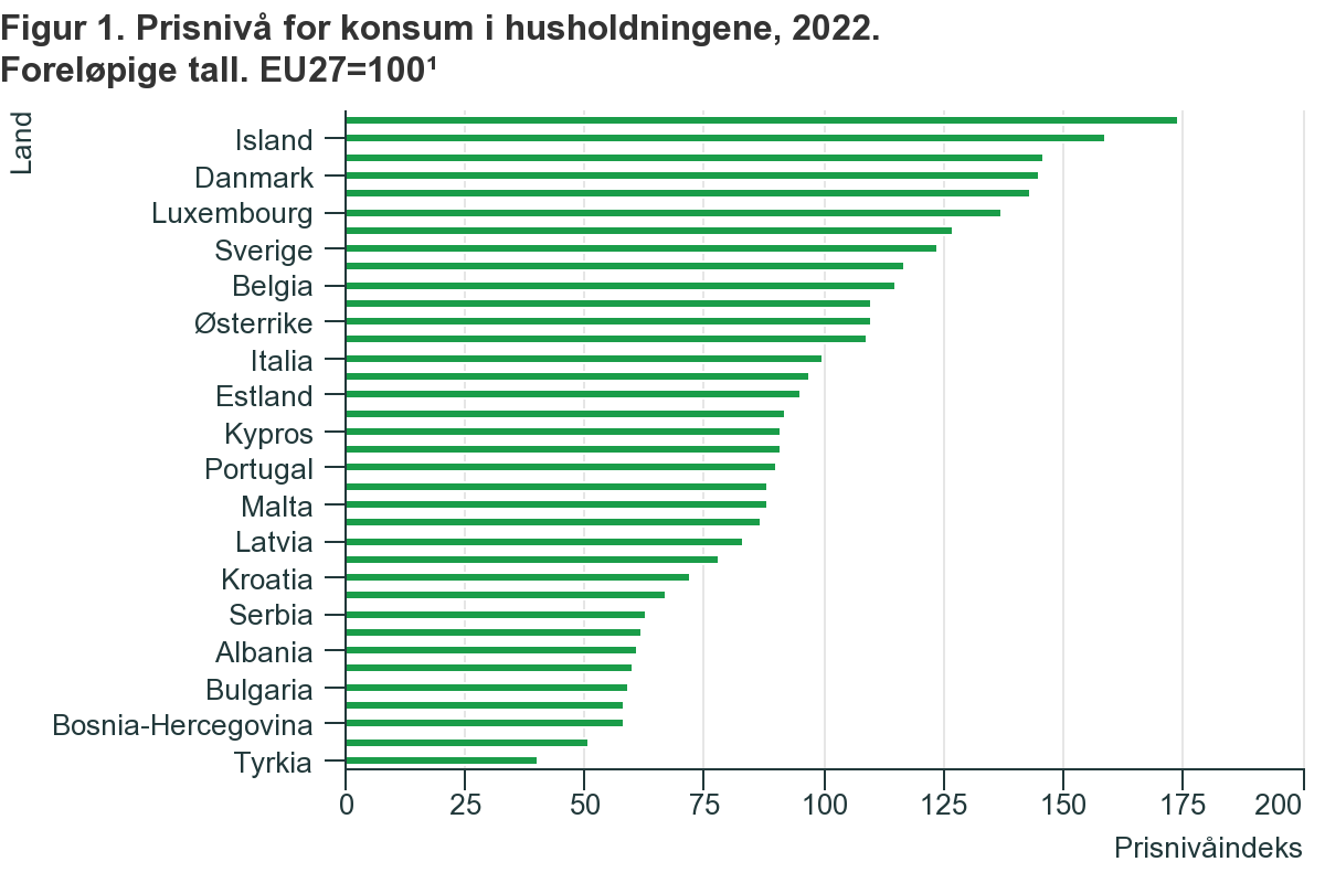 1) EU27=100 betyr at prisnivå er uttrykt som indekser der gjennomsnittet for EU-landene er satt lik 100. En prisnivåindeks for Norge lik 143 betyr at det norske prisnivået var 43 prosent høyere enn gjennomsnittet for EU27. Kilde: Sammenlikning av prisnivå i Europa, Statistisk sentralbyrå og Eurostat.