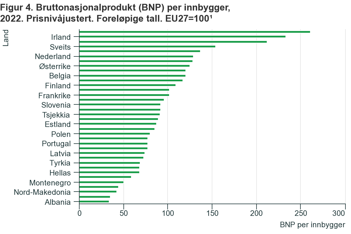 ¹ EU27=100 betyr at BNP per innbygger er uttrykt som indekser der gjennomsnittet for EU-landene er satt lik 100. Kilde: Sammenlikning av prisnivå i Europa, Statistisk sentralbyrå.