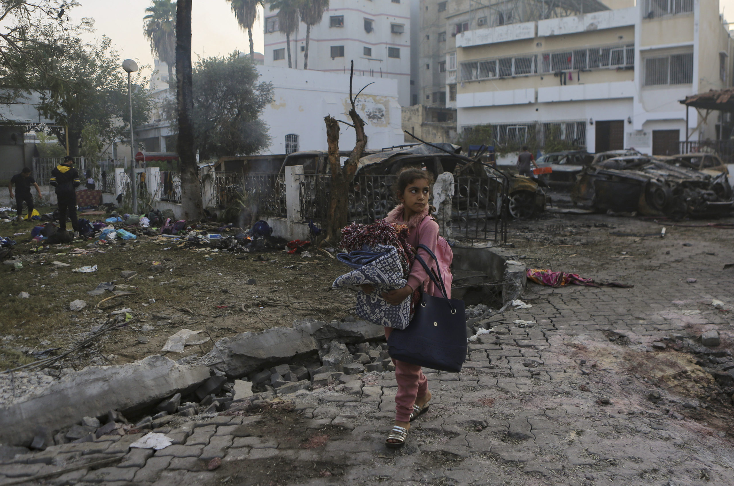 En jente bærer tepper og en veske forbi eksplosjonsstedet der flere hundre personer mistet livet ved Al-Ahli-sykehuset tirsdag. Foto: Abed Khaled / AP / NTB