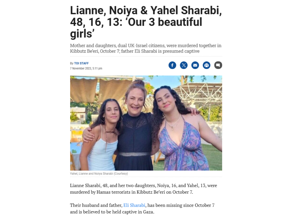 Ifølge en Twitter-bruker ble Lianne Sharabi og hennes to barn, Noiya og Yahel, myrdet så brutalt at de bare kunne identifiseres ved hjelp av tannlegejournaler og DNA-analyse.