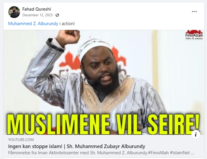 Nok et bevis for at islam vil seire – også i Norge – finner vi i videoen Qureshi deler av Muhammed Zubayr Alburundy, som er skribent og motivasjonstaler for Islam Net.
