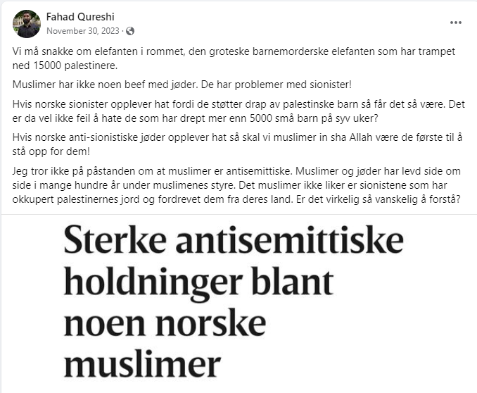 En gjennomgang av Fahad Qureshis Facebook-side viser hans intense hat mot Israel og det jødiske folk. Ingen av oss er overrasket, men alle i Norge burde være dypt bekymret over at denne mannen har tillatelse til å bygge et aktivitetssenter og moské i Groruddalen.