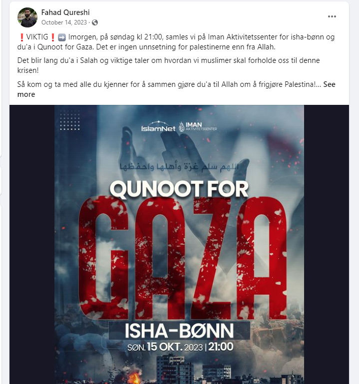 Den 14. oktober annonserte han at Islam Nets medlemmer skal samles på Iman Aktivitetssenter for isha-bønn og du’a i Qunoot for Gaza.