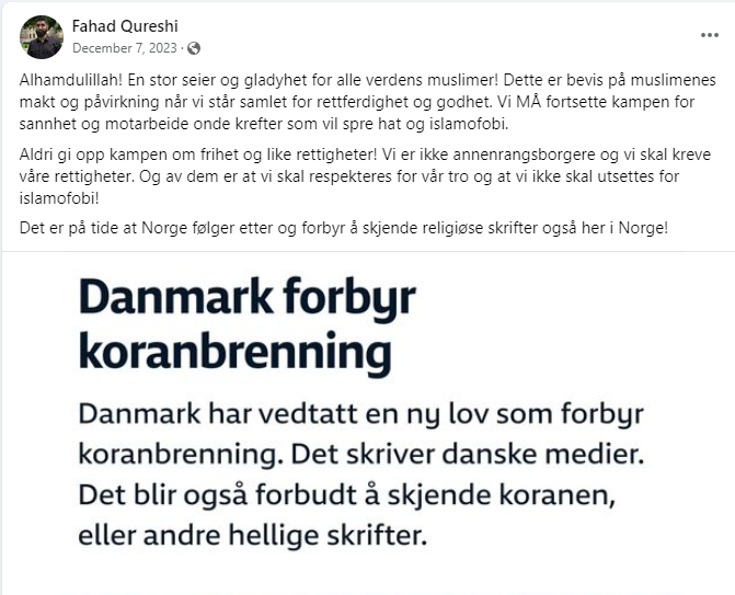 Danmarks knefall for islam er en stor seier for ham, og han mener det er på tide at Norge følger etter og forbyr å skjende religiøse skrifter.