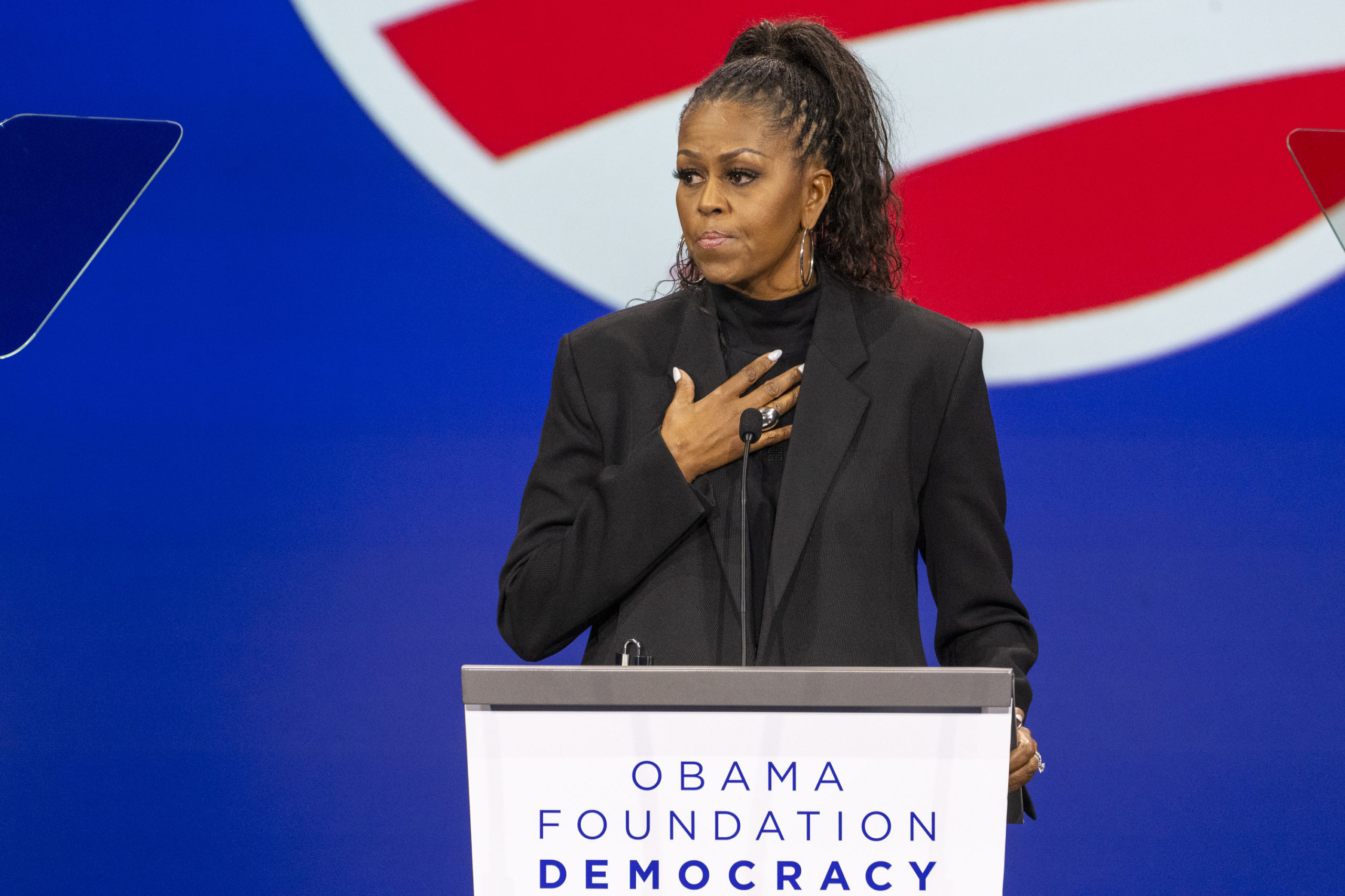 Michelle Obama taler under Obama Foundation Democracy Forum i Chacago den 3. november 2023. Foto: Tyler Pasciak LaRiviere / Chicago Sun-Times via AP / NTB.