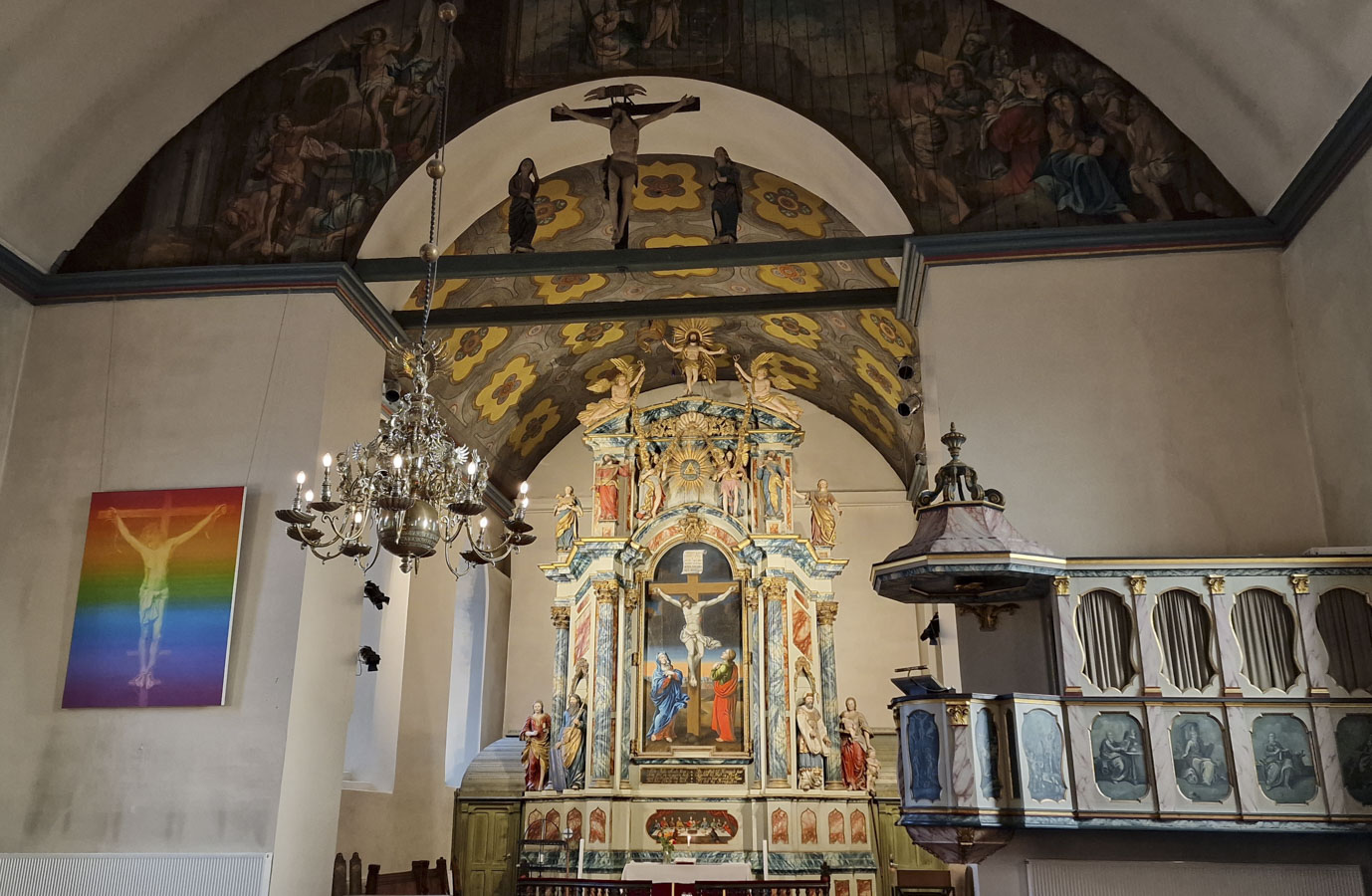 Den gamle altertavlen i Vår Frue kirke i Trondheim har fått konkurranse av Pride-krusifiks av Jesus, malt av kunstneren Sverre Bjertnæs. (Rainbow Crucifixion, 2003). Den gamle altertavlen fra ca. 1743 skal være Norges største. Vår Frue er en middelalderkirke som benyttes av Kirkens Bymisjon. Foto: Bente Haarstad.