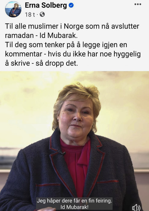 Denne invasjonen, bestående av mange hundre tusen med en annen kultur og andre verdier enn våre egne, er det mange som nå har oppdaget, selv om det foregår skritt for skritt, nærmest i all stillhet, og med våre myndigheters aksept. For å sikre den stillheten, har de tradisjonelle mediene, og andre, gjerne stengte kommentarfelt for alt som omhandler fremmedkulturell innvandring generelt og islam spesielt. Erna ønsker visst også fravær av kritikk. For i introen til videoen, etter «Til alle muslimer i Norge som nå avslutter ramadan: Id Mubarak.» skrev hun: