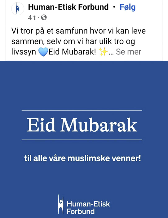 Hvor langt har egentlig islamiseringen kommet når til og med ateistene i Human-Etisk Forbund feirer islam, samtidig som de år inn og år ut bruker statsstøtten til å bekjempe alt kristent? Denne er fra i dag: