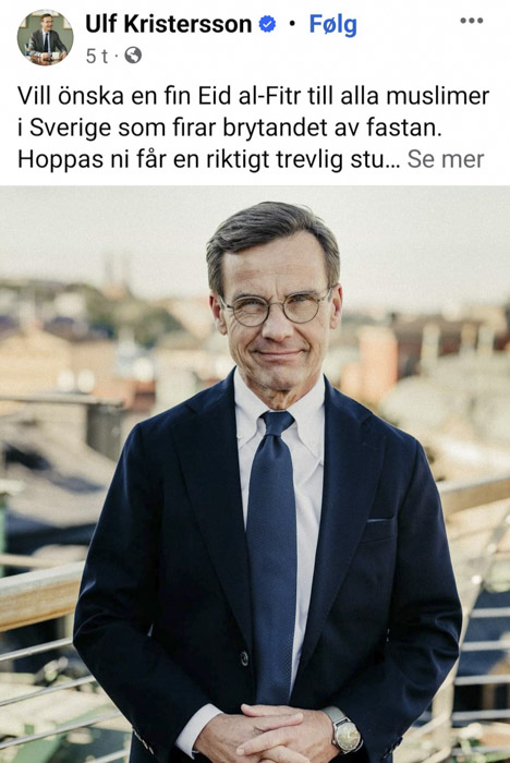 Også Ernas makker i Sverige synes det er viktig å gi islamsk oppmerksomhet, statsminister Ulf Kristersson, partileder for Moderaterna, ventet til 10. april:
