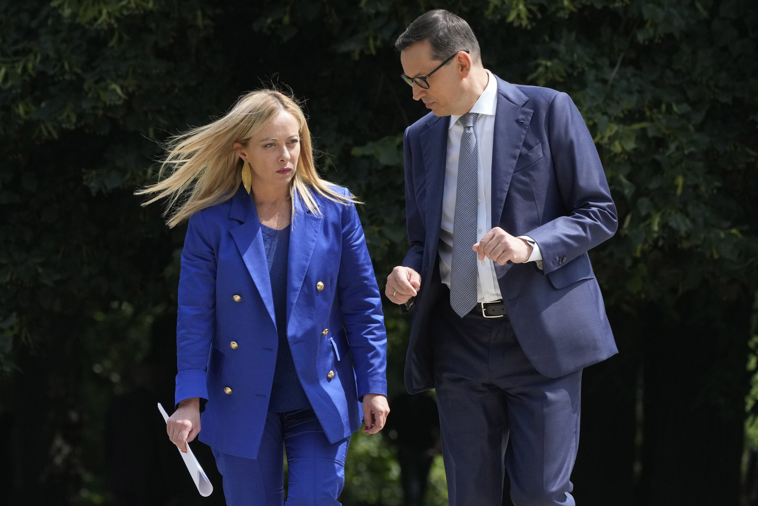 PiS-nestlederen er ikke desto mindre på bølgelengde med Giorgia Meloni, og Morawiecki sier seg enig i den italienske statsministerens nylige påstand om at den nominelt konservative EPP-gruppen, den sosialdemokratiske S&D-gruppen og den liberale Renew-gruppen i EU-parlamentet utgjør et oligarki, skriver Le Figaro.