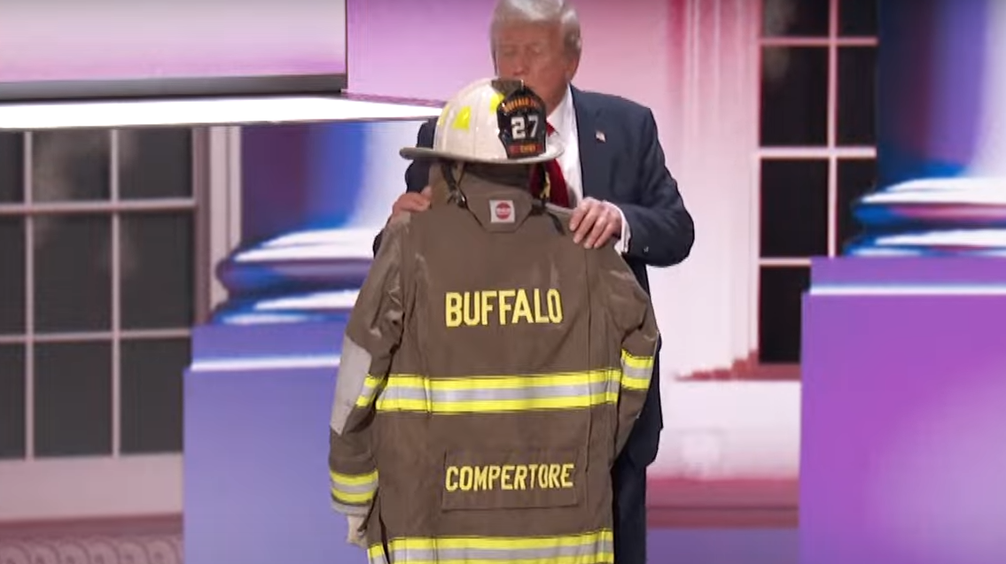 Talen startet for øvrig med å ta frem hjelmen og uniformen til den avdøde Corey Comperatore (50), som døde under attentatet mot Donald Trump.