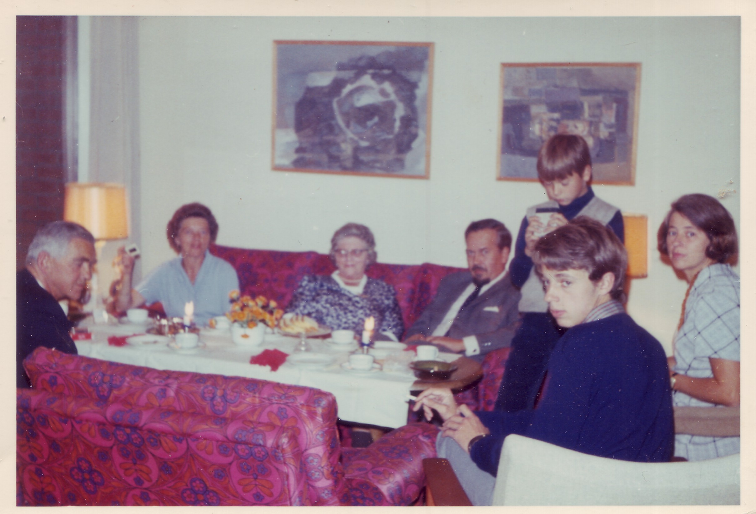 Artikkelforfatteren med deler av slekten i Kirkeveien 42C på Høvik. Han er begynt å røke hjemme. (Foto: privat)