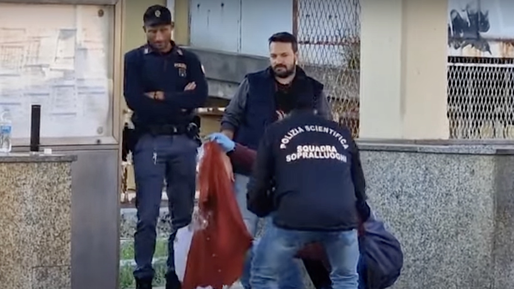 Italienske kriminalteknikere sikrer spor etter knivstikkingen på stasjonen i Rivarolo nær Genova den 4. november 2024. Stillbilde: Quotidiano Nazionale / YouTube.