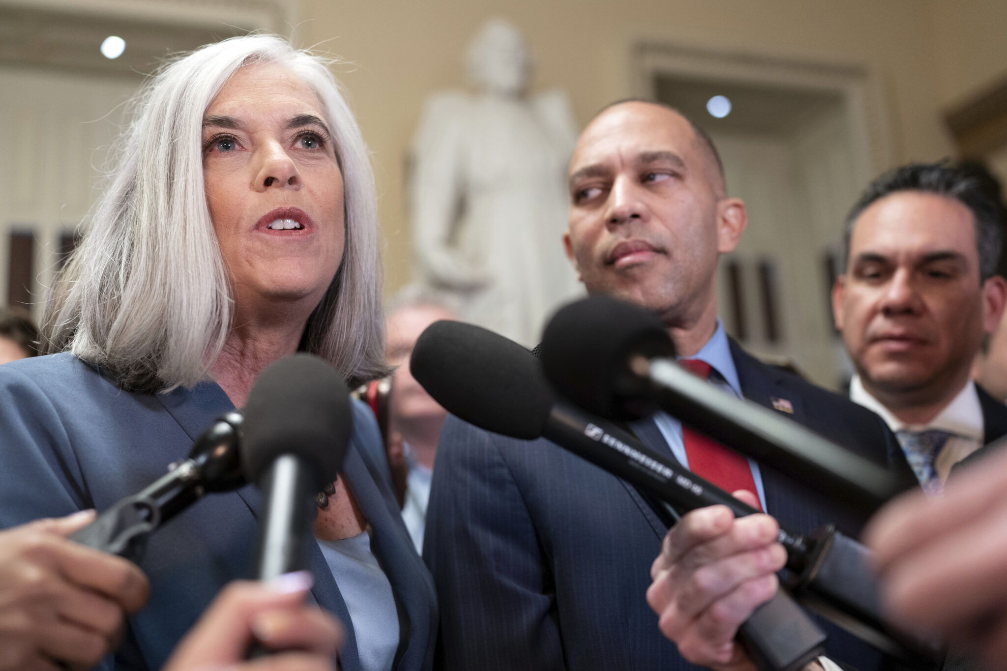 Demokratenes innpisker og minoritetsleder i Representantenes hus, Katherine Clark Hakeem Jeffries, snakker med pressen i Capitol i Washington D.C. den 20. oktober 2023. I bakgrunnen står partifellen Pete Aguilar. Foto: Jose Luis Magana / AP / NTB.