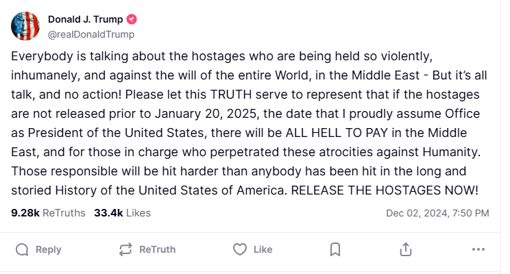 Alle snakker om gislene som blir holdt så brutalt, umenneskelig og mot hele verdens vilje, i Midtøsten – men det er bare prat, og ingen handling! La denne SANNHETEN tjene til å understreke at hvis gislene ikke blir løslatt før 20. januar 2025, datoen da jeg stolt tiltrer som USAs president, vil det bli et HELVETE Å BETALE i Midtøsten, og for de ansvarlige som begikk disse grusomhetene mot menneskeheten. De ansvarlige vil bli rammet hardere enn noen har blitt rammet i USAs lange og sagnomsuste historie. LØSLAT GISLENE NÅ!