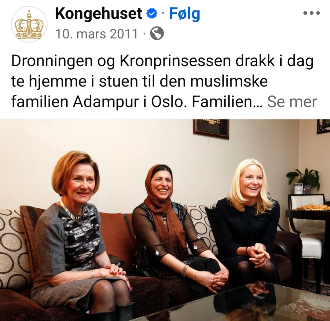 Kongehuset er selvsagt ikke ukjent med de islamske miljøene og organisasjonene som nå befinner seg i Norge. Mange moskeer er besøkt, så også familier. Som da dronning Sonja og kronprinsessen drakk te hjemme i stuen til familien Adampour i mars 2011.