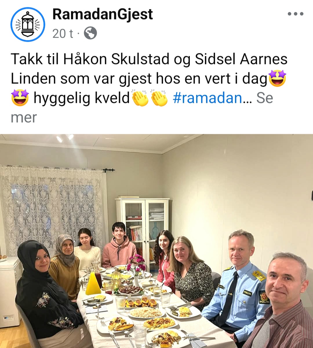 «Takk til Håkon Skulstad og Sidsel Aarnes Linden som var gjest hos en vert i dag. Hyggelig kveld», skriver Ramadangjest på Facebook. Håkon Skulstad er til daglig politidirektør, det vil si leder for norsk politivesen, og stilte i uniform. Mens Sidsel Aarnes Linden er seniorrådgiver i politidirektoratet, ifølge det hun selv oppgir på Facebook.