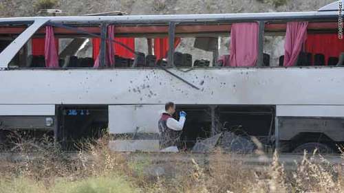 CNN Turk, CNN’s sister network, broadcast images of the white civilian passenger bus standing in the middle of the road, with purple curtains blowing through shattered windows.