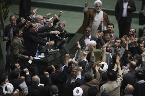 Hva skal man si om den iranske nasjonalforsamlingen, der parlamentarikere tirsdag sto som en mobb og ropte død over Moussavi og Karroubi. Parlamentarikerne forlangte at rettsvesenet skulle dømme dem til døden. Hvorfor? Fordi iranerne igjen marsjerer i gatene og krever demokrati. Stort tydeligere kan ikke parlamentarikerne vise at de tilhører et lovløst regime.