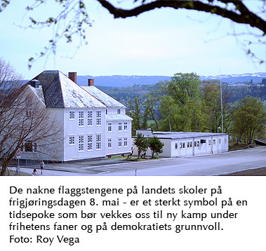 Nobelprisvinner Elie Wiesel har pekt på likegyldigheten som en av vår tids største fiender. Jeg har utsikt til en stor skole, omgitt av et slør av nyutsprungne bjørketrær og fjell med smeltende striper av snø i horisonten. Himmelen er blå, sola varmer, en tilsynelatende idyll. Det er frigjøringsdagen, men foran skolen, står en lett synlig, stor flaggstang. Den er skrikende naken. De fleste skoler i dette landet flagger ikke på frigjøringsdagen. Slik er vår tid. De nakne flaggstengene er paradoksalt nok også særdeles sterke symboler som forteller sin egen innhule historie på selveste frigjøringsdagen, symbol på en lumsk tidsånd som i seg selv bør bekjempes. Nakne flaggstenger var selve symbolet på den optimale ufrihet i det okkuperte Norge. Men noen vil ha det slik nå, med nakne flaggstenger. Vi får et bilde av en nasjon i farlig dvale, hvor tidsvitnenes budskap ebber ut, uten et eneste ekko i skolestuene.