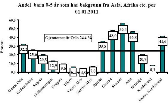 Noen figurer utarbeidet av Oslo kommunes utviklings- og kompetanseetat er nokså illustrerende i så måte. Om man betrakter antall barn i aldersgruppen 0-5 år fordelt etter bydeler, oppdager en at de med innvandringsbakgrunn fra Asia og Afrika utgjør en stor andel der hvor man forventer: