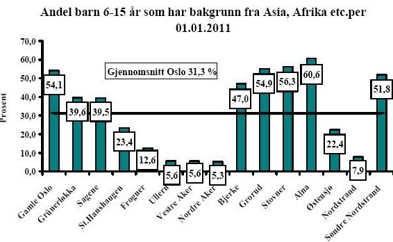 Barna med afrikansk/asiatisk bakgrunn utgjør altså 24,4% av aldersgruppen 0-5 år i hele byen. For de skolepliktige årene 6-15 år er deres andel derimot hele 31,3%, altså noe over en fjerdedel mer. Forskjellen er dog enda større enn dette i groruddalsbydelene Alna og Bjerke samt de østlige sentrumsbydelene Grünerløkka og Gamle Oslo, samtidig som den bare er en sjettedel i Vestre Aker. I de vestlige bydelene Ullern og Nordre Aker er andelen lavere: