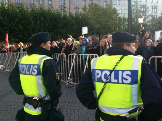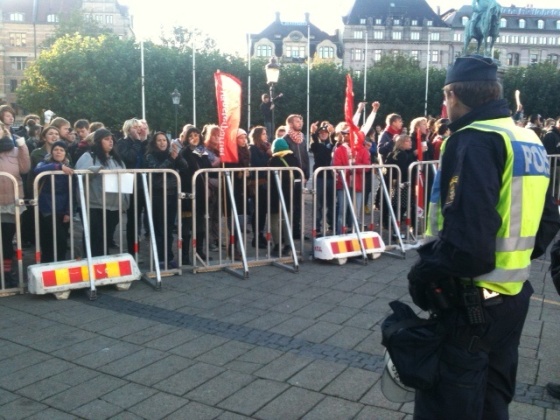 Så kommer äntligen talen igång. SDU:arna har skruvat upp volymen i högtalaren till max och det tjuter i öronen på oss som står innanför avspärrningen. Utanför avspärrningarna står unga kvinnor och män och sliter i kravallstaketen för att åstadkomma så mycket väsen som möjligt. Poliserna låter dem hållas och säger bara till när de blir för våldsamma.