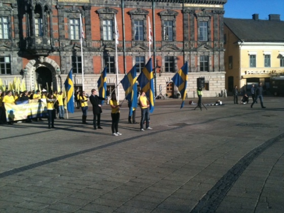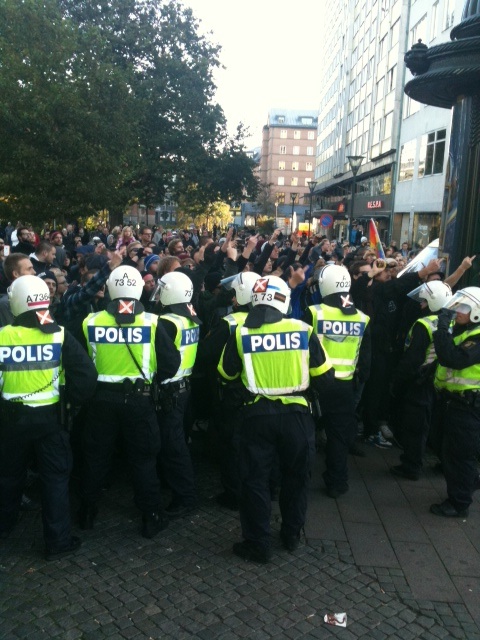 Vad de hundratals poliserna kostar skattebetalarna har jag ingen aning om, men den här gången klarar Malmöpolisen i alla fall sin uppgift. Till skillnad från 2009 när en Israeldemonstration fick avbrytas på grund av äggkastande motdemonstranter. Det tar visserligen en hel timme innan tåget släpps iväg från Stortorget och det berodde enligt uppgift på att polisen rensade bort ligister från tågets väg. Tre personer greps misstänkta för förberedelse till upplopp och totalt omhändertogs ett tjugotal människor. Under väntetimmen står ungdomarna i kortärmade t-shirtar och håller tappert upp sina svenska flaggor och SDU-banderoller.