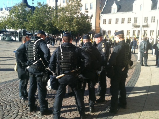 Halva det gigantiska Stortorget är avspärrat med kravallstaket och det är inte helt lätt att övertyga poliserna och SD:s representanter om att jag är journalist, särskilt som jag inte hittar mitt presskort. Men jag blir till sist insläppt, jag ser väl snäll ut. Ovanför oss cirklar en polishelikopter, varv efter varv. Det står piketbussar och ”svarta major” i vartenda hörn av torget och sex ridande poliser står beredda utanför det vackra, vita landshövdingeresidenset och framför det ännu vackrare Rådhuset väntar gulklädda SDU:are på att ställa upp för sin demonstration. På andra halvan av Stortorget, bakom kravallstaketen, står de som kallar sig antirasister. De skriker: ”Inga rasister på våra gator! Inga rasister i våran riksdag!” Några sjunger John Lennons Imagine men sedan hör jag plötsligt: ”Ut med packet!”