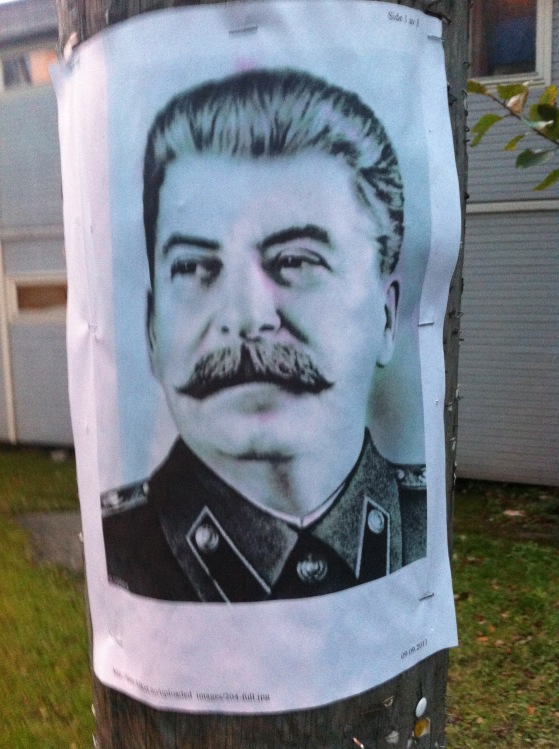 Hvis det hadde vært en annen diktator med bart ville plakaten neppe fått henge lenge. Men Stalin omfattes ikke av en slik avsky. Det er spesielt. I det minste alle med et snev av sosialistiske sympatier burde rive ned Stalins ansikt. Ingen drepte flere kommunister og sosialister enn ham. Ut over det millioner av andre mennesker.