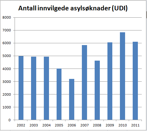 Man ser altså at 2010 og 2011 var de to årene det ble innvilget flest asylsøknader, selv om det var en nedgang fra 2010 til 2011. Det betyr at forpliktelsene Norge har tatt på seg de siste årene, er større enn de var før.