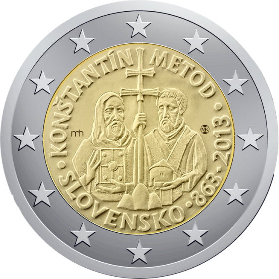Slovakiets nationalbank udgiver mønten i anledning af 1150-året for de græske helgenbrødre Cyril og Methodius’ ankomst til blandt andet Slovakiet, som var en del af det daværende storrige Stormähren. Flere unavngivne medlemslande i EU har bedt Slovakiet om at fjerne de to kors på helgenbrødrenes tøj samt glorierne rundt om deres hoveder – et krav, som landet efterkommer. Kravet vækker både bekymring og kritik hos den katolske kirke i Slovakiet.