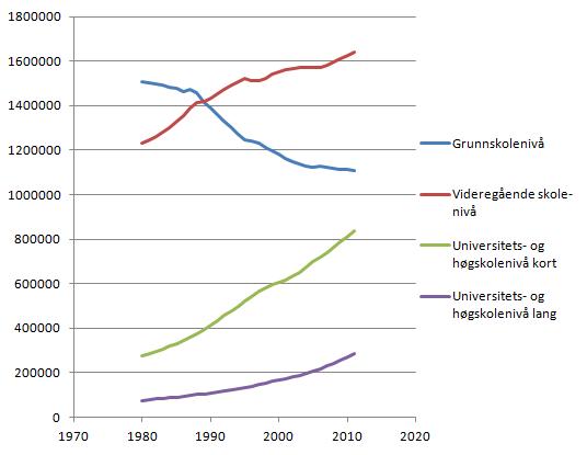 Det er i dag omtrent like mange med videregående skolegang som det i 1980 var med bare grunnskole. Antallet med lang universitets- eller høyskoleutdannelse er like mange som med kort for tredve år siden. Og antallet med høyere utdannelse av kort varighet har kraftig nærmet seg antallet som før bare hadde videregående. Store deler av befolkningen er altså blitt «oppgradert» et hakk sammenlignet med forrige generasjon.