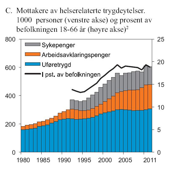 Selv for Finansdepartementet og Statistisk sentralbyrå (SSB) er det altså umulig å finne sammenlignbare tall for sykepenger før og etter 1992. Det kan uansett konstateres at mer enn 600.000 personer i yrkesaktiv alder ikke er i arbeid, og at mottagerne av uføretrygd og arbeidsavklaringspenger (AAP) nesten er tredoblet siden 1980.