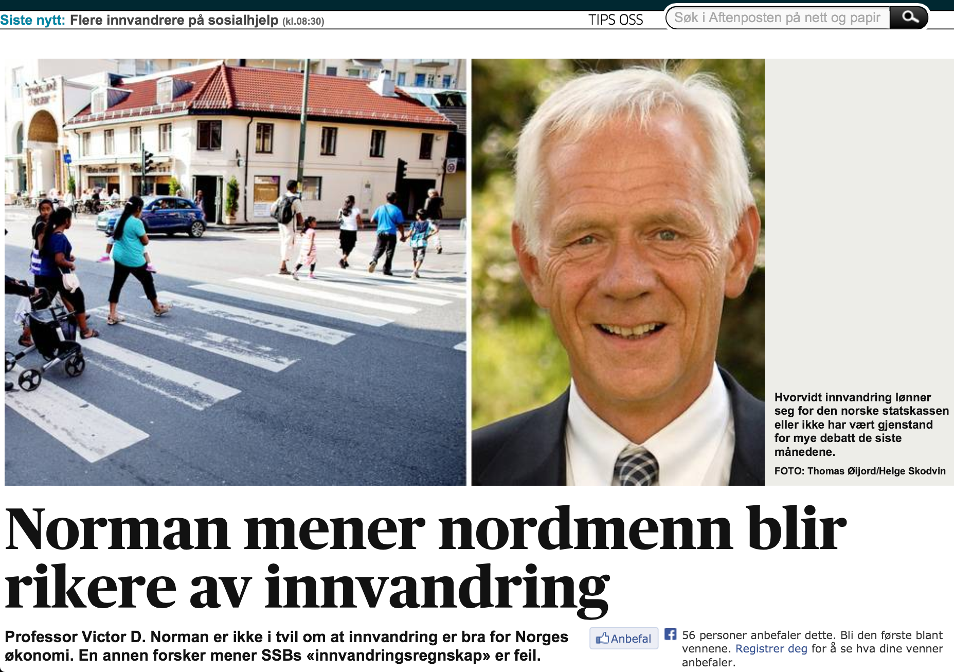 Mye tyder imidlertid på at desken i Aftenposten ikke leser sin egen avis, for samtidig som de kjører på med artikler som skal motbevise tall de ikke liker, legger de selv ut artikler som i aller høyeste grad motsier de siste dagers hellige. Alle som leste Langbergs lykkelige overskrift: Mener nordmenn blir rikere av innvandring, ble øverst i venstre hjørne oppfordret til å klikke på en artikkel med en ørliten tilleggsopplysning.