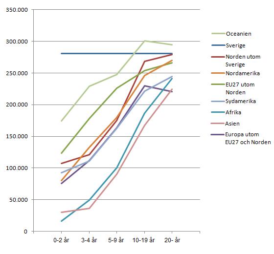 Tall fra svenske Statistiska centralbyrån (SCB) over medianinntekt som funksjon av botid for 20-64-åringer av begge kjønn i 2011, viser at det kun er vestlige som tar igjen – og til dels går forbi – svenskene i lønnsutvikling, og det først etter tjue års botid: