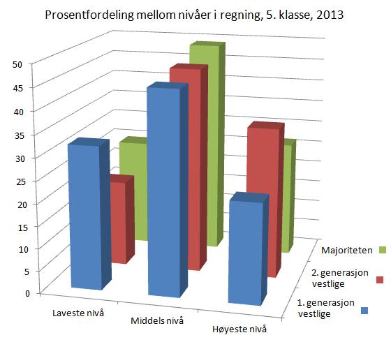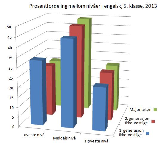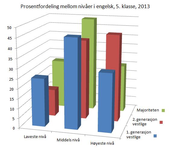 Vestlige innvandrere er (som ventet) en god del dårligere i lesing og (kanskje en smule uventet?) litt dårligere i regning enn majoriteten i 1. generasjon, men noe bedre i engelsk. Barna deres innhenter de forsprang som finnes og vel så det: Uansett fag har barn av vestlige innvandrere prosentvis flere på høyeste nivå, og færre på laveste nivå, enn majoritetens barn.