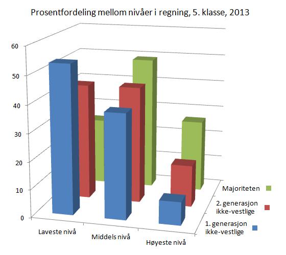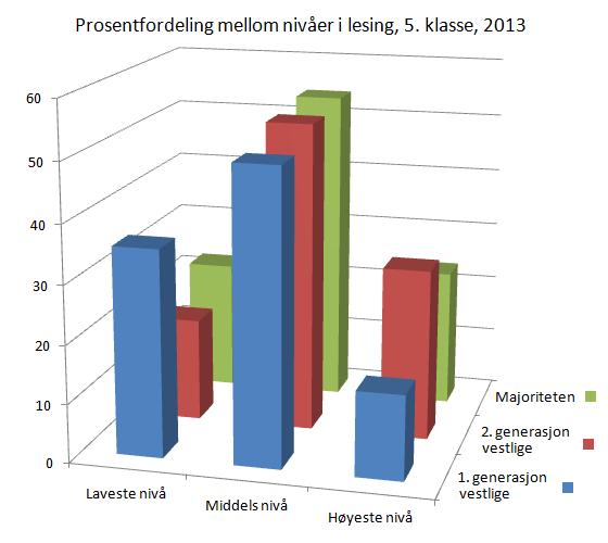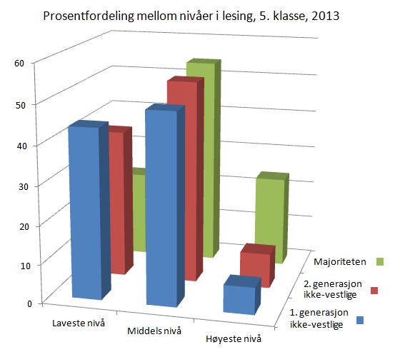 For 5. klassetrinn er tallene for lesing dessverre nokså nedslående. Gapet mellom majoriteten og 1. generasjon ikke-vestlige er ikke i nærheten av å lukkes i 2. generasjon. Andelen på laveste nivå er ned fra 43,9 til 38,5 prosent; på høyeste nivå er den opp fra 7 til 9 prosent.