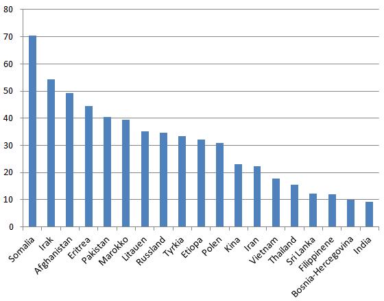 Over sytti prosent av barna med somalisk bakgrunn tilhører lavinntektsgruppen. Det samme gjør over femti prosent av barna med irakisk bakgrunn, og nesten femti prosent av barna med bakgrunn fra Afghanistan. Andelen er også høy for Pakistan, og forbedres ikke for det opphavslandets vedkommende med lang botid.